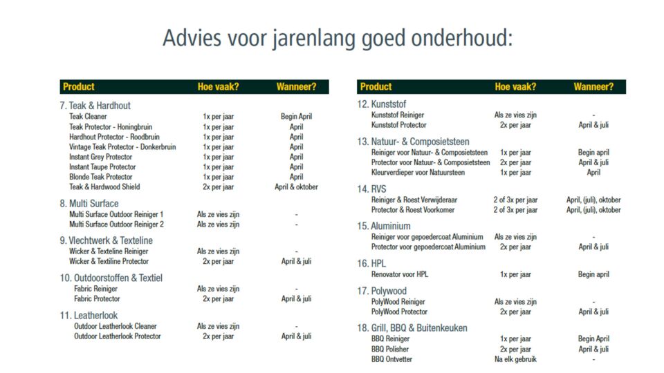 Om verweerd teakhout schoon te maken, maakt u eenvoudig gebruik van Teak Cleaner 60002, dat speciaal is ontwikkeld om schimmels en algen te doden binnen in het teakhout. Volg simpelweg de instructies op de fles en de kleur zal worden hersteld. Omdat het schoonmaken van teak enige tijd en moeite kost, raden wij aan om Teak Protector 60001 of Teak Shield 60004 te gebruiken voordat het verweren wederom begint.